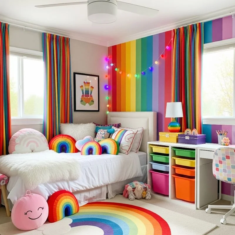 Celebrate every color of the spectrum with a rainbow-themed room that radiates joy and positivity. Rather than overwhelming with competing hues, use white as your base and add rainbow accents strategically. Create an ombré wall using paint samples in gradient shades or apply rainbow wall decals. Organize books, toys, and accessories by color for both function and visual impact. Include rainbow-themed bedding, rugs, or curtains as focal points. Add cloud-shaped shelves or lighting to complete the sky theme. Balance the brightness with plenty of white space to prevent sensory overload. This cheerful design encourages creativity and optimism while teaching color recognition and organization skills. The vibrant atmosphere energizes mornings and brightens moods after tough days.