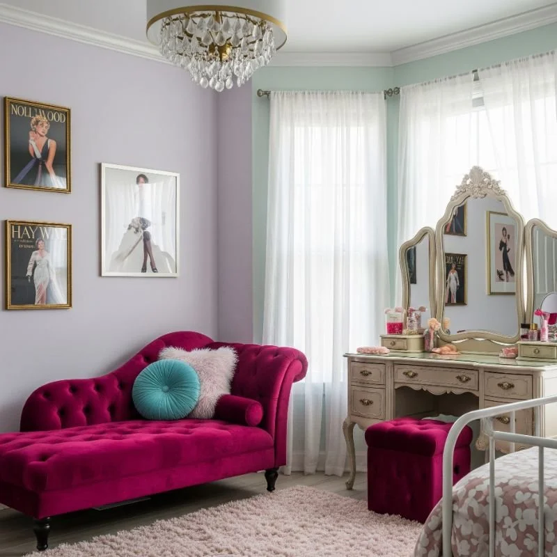 Channel old Hollywood elegance with a vintage glamour theme that makes your daughter feel like a star. Incorporate antique or antique-inspired furniture pieces like ornate mirrors, tufted headboards, or vintage vanities found at flea markets. Choose luxurious fabrics in jewel tones like emerald, sapphire, or amethyst for curtains and bedding. Add metallic accents through gold or silver picture frames, lamp bases, and decorative objects. Display vintage-inspired artwork or classic movie posters in coordinating frames. Include a chandelier or crystal-adorned light fixture as a stunning focal point. Velvet cushions, faux fur throws, and silk flowers complete the glamorous atmosphere. This sophisticated style teaches appreciation for timeless beauty while creating an Instagram-worthy space.
