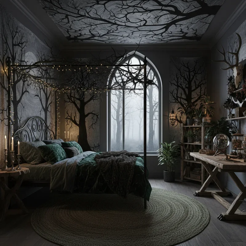 Bring the mysterious beauty of dark woodlands indoors with this nature-inspired gothic approach. Deep forest green walls paired with black accents create an immediately organic feeling, while natural wood furniture in dark stains grounds the space. Incorporate branches as decorative elements, perhaps suspended from the ceiling or arranged in tall vases. Botanical prints featuring poisonous plants or night-blooming flowers provide wall art with gothic edge. Moss terrariums and dark-leafed plants like black velvet alocasia add living elements. Use textures that reference nature like stone, bark, and raw linen alongside traditional gothic fabrics. Lighting mimics dappled forest light filtering through trees, created through layered fixtures and strategic placement. This design appeals to those who find gothic beauty in nature's darker aspects, creating bedrooms that feel like enchanted forest clearings.