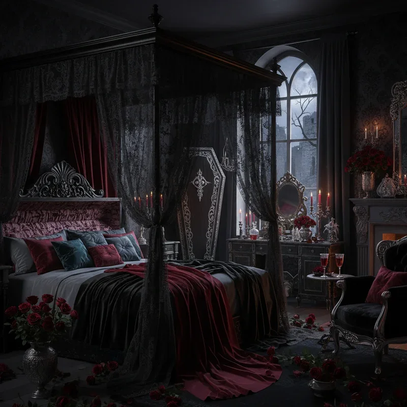 Channel your inner immortal with a bedroom that drips with seductive elegance and timeless romance. Deep crimson walls or wallpaper create an enveloping warmth, while black silk sheets and velvet throw pillows invite endless lounging. An ornate mirror with an aged patina reflects candlelight, creating an atmospheric glow that flatters and mystifies. Red roses in antique vases provide the only pop of bright color, their thorns reminding us that beauty often comes with edges. Sheer black curtains layer over heavier drapes, allowing you to control light levels throughout the day. Include a vintage vanity with ornate perfume bottles and antique jewelry boxes displaying your treasures. This design embraces sensuality and drama, perfect for those who view their bedroom as a personal stage. The overall effect should feel intoxicating and intimate, like a secret kept from the daylight world.