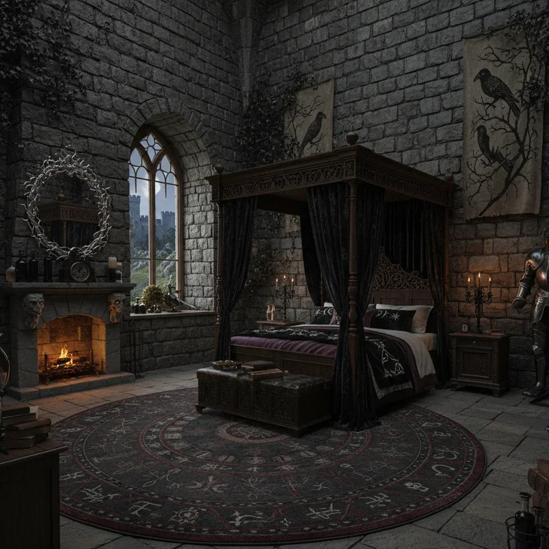 Transform your bedroom into a fortress sanctuary straight from fantasy novels and historical dramas. Stone-textured wallpaper or panels create authentic castle vibes, while heavy tapestries depicting mythical scenes hang as statement pieces. A substantial wooden bed frame with carved details suggests furniture that's survived centuries, paired with faux fur throws for warmth and luxury. Iron wall sconces with flickering LED candles provide ambient lighting that mimics torchlight. Include a wooden trunk at the bed's foot for storage with medieval charm, and perhaps a suit of armor standing guard in the corner. Deep jewel tones like sapphire, emerald, and amethyst accent the darker palette, referencing royal chambers. This immersive design transports you completely, perfect for history enthusiasts or fantasy lovers who want their bedroom to feel like an escape to another realm entirely.