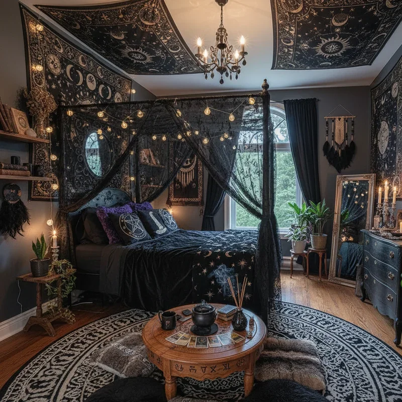 Blend mystical elements with bohemian comfort for a bedroom that feels both magical and cozy. Macrame wall hangings in black or deep indigo frame the bed, while shelves display crystal collections, tarot decks, and apothecary jars filled with herbs. Layered textiles in various dark patterns create a collected-over-time aesthetic, mixing velvet, linen, and woven fabrics freely. A low platform bed or mattress on the floor embraces bohemian casualness, piled high with pillows and throws. Hanging plants in dark planters bring life energy, their trailing vines adding organic movement. Include a meditation corner with floor cushions and candles for spiritual practices. Moon phase artwork, celestial charts, and vintage botanical prints decorate walls. This eclectic approach celebrates personal spirituality and natural magic, perfect for free spirits who find gothic beauty in earthier aesthetics.
