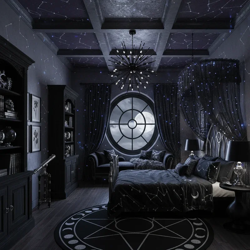 Look upward for inspiration with a bedroom that celebrates the mysterious beauty of night skies. Deep navy or black ceiling painted with metallic stars creates an overhead focal point, while constellation maps and astronomical prints decorate walls. A moon phase mirror or artwork provides a stunning centerpiece, celebrating lunar cycles. Include actual telescopes or celestial globes as both functional items and decorative elements. String lights mimicking stars add ambient lighting with magical effect, while moon lamps provide soft, otherworldly illumination. Metallic silver accents reference starlight, appearing in frames, hardware, and decorative objects. Incorporate deep midnight blues alongside blacks to suggest the hour just before dawn. This cosmic approach appeals to dreamers and star gazers who find gothic beauty in the infinite mysteries above us.