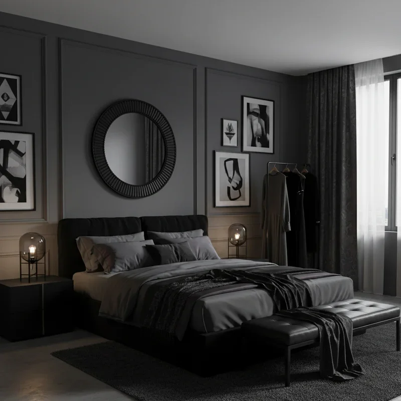 Embrace the power of total darkness with a bedroom that celebrates black in all its nuanced glory. This bold approach uses various black tones and textures to create depth without introducing other colors. Matte black walls contrast with glossy black furniture, while charcoal bedding differs subtly from true black curtains. The key lies in layering different materials like leather, velvet, cotton, and metal, all in black, creating visual interest through texture rather than color. Strategic lighting becomes crucial, with multiple sources at different heights preventing the space from feeling cave-like. Silver or chrome accents provide minimal metallic relief without disrupting the monochromatic commitment. This daring design choice creates incredibly cohesive, enveloping spaces that feel like being wrapped in midnight itself. Perfect for purists who believe black is not just a color but a complete aesthetic philosophy.