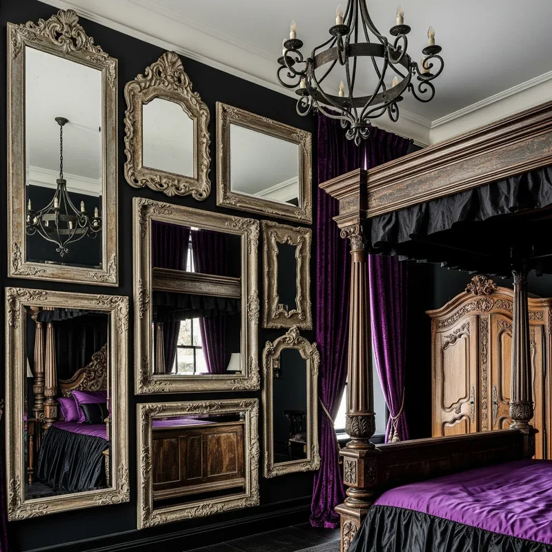 Mirrors amplify Gothic drama by reflecting candlelight, creating illusions of space, and adding vintage charm to your dark sanctuary. Collect ornate frames in tarnished silver, aged gold, or painted black that look like they've witnessed centuries of secrets. Group different sizes and shapes on one wall for a gallery effect that suggests accumulated family heirlooms rather than a shopping spree. Large floor mirrors leaning against walls create the illusion of doorways to other dimensions, especially when positioned to reflect interesting architectural features. Don't shy away from mirrors with slight imperfections or age spots that add character and authenticity to your Gothic narrative. Venetian mirrors with their elaborate etched designs feel especially at home in Gothic bedrooms. These reflective surfaces become portals that multiply your Gothic elements, making your dark bedroom feel mysteriously larger.