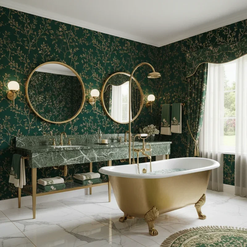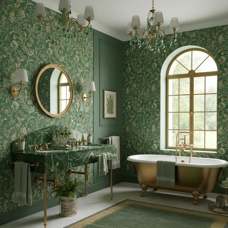 A single wall wrapped in luxurious green wallpaper becomes your bathroom's statement piece, like hanging a masterpiece above your sink. Choose patterns that speak to you: tropical palm fronds for vacation vibes, geometric designs for modern edge, or classical damask for timeless elegance. The key lies in selecting moisture-resistant wallpaper designed for bathroom use. Deep green backgrounds with gold metallic accents create stunning depth that changes with lighting throughout the day. This approach offers maximum impact with minimal commitment, perfect for renters or design experimenters. Large-scale patterns make small bathrooms feel grander, while subtle textures add sophistication without overwhelming. Position your accent wall behind the vanity or bathtub for optimal visual impact. The wallpaper becomes a backdrop that makes everything else in your bathroom shine brighter.