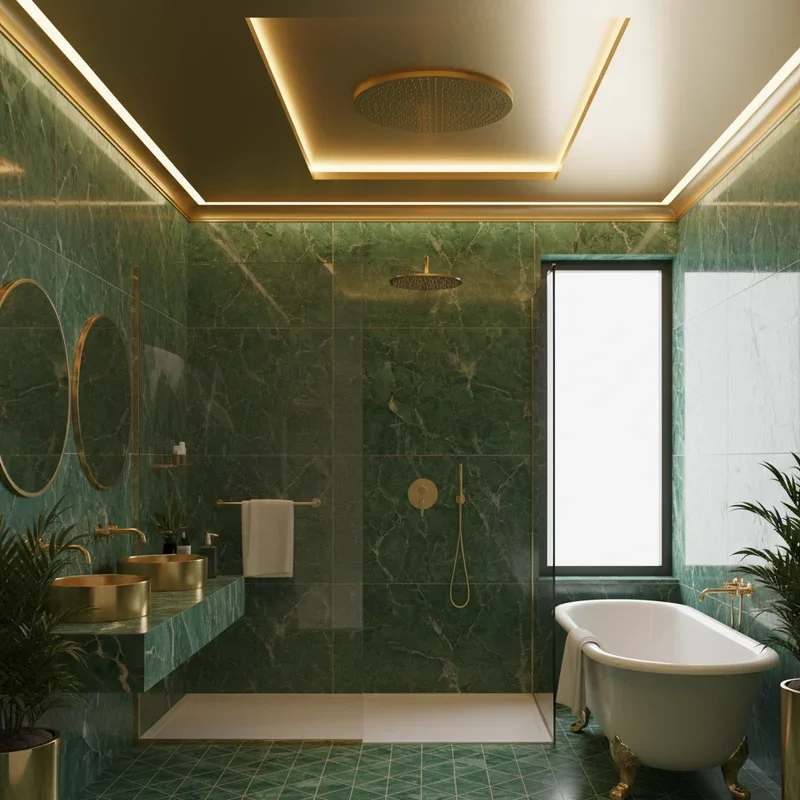 Natural green marble with gold veining brings nature's artistry directly into your bathroom, creating surfaces that feel like precious stones. Each slab tells a unique geological story, ensuring your bathroom remains one-of-a-kind. The veining creates organic patterns that no manufactured material can replicate, adding movement and life to static surfaces. Use it for countertops, shower walls, or flooring for maximum impact. The natural variations mean every angle offers something new to discover. Green marble ranges from subtle sage with whispers of gold to dramatic emerald with bold metallic streaks. This material ages gracefully, developing a patina that adds character over time. The combination of green and gold occurs naturally, proving this color pairing has nature's stamp of approval.