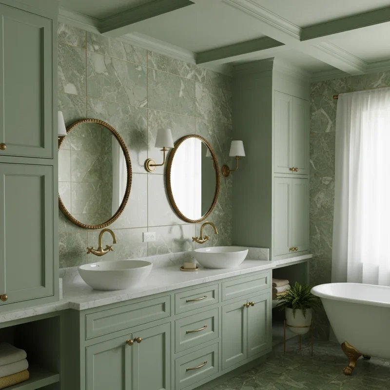 Sage green cabinets bring sophisticated earthiness that feels both trendy and timeless, like wearing a perfectly tailored linen suit. This muted green works with any style, from farmhouse to ultra-modern, creating a calming foundation for your bathroom design. The soft color makes bold gold hardware pop without overwhelming your senses. Paint existing cabinets for an affordable refresh, or invest in custom cabinetry for long-term luxury. Sage plays well with both warm and cool tones, making it incredibly versatile for mixing materials. The color ages beautifully, developing character without looking dated. Add glass knobs with gold bases for subtle sparkle, or go bold with oversized brass pulls. These cabinets create a spa-like atmosphere that makes every day feel like a retreat.