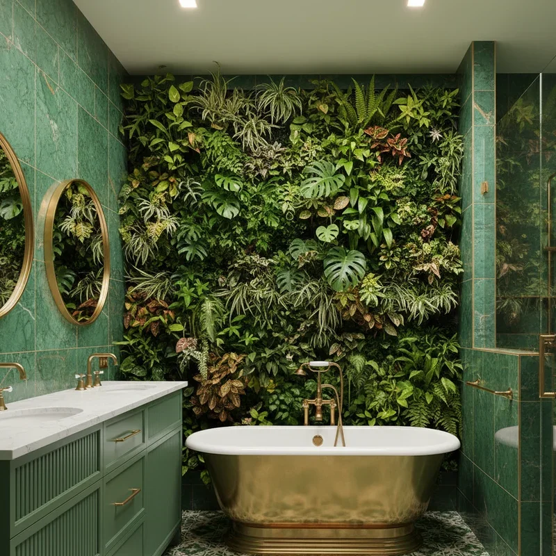 A living wall of green plants amplifies your color scheme while purifying air and adding organic beauty. This vertical garden creates a stunning focal point that changes and grows over time. Choose moisture-loving plants like pothos, ferns, and philodendrons that thrive in bathroom humidity. Install a modular system with gold or brass frames for easy maintenance and elegant presentation. The varying shades of green foliage create natural depth and texture no paint could replicate. Plants improve air quality while adding movement and life to static spaces. Position grow lights with gold fixtures to ensure plants thrive even in windowless bathrooms. This living art piece makes your bathroom feel like a luxury greenhouse where daily routines become communion with nature.