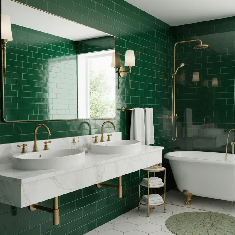 Emerald green subway tiles transform ordinary walls into jewel-box perfection that catches light like precious stones. These rich tiles create depth and luxury while maintaining the classic appeal of traditional subway patterns. Picture them catching morning sunlight, shifting from deep forest to bright jade throughout the day. The glossy finish reflects light beautifully, making your bathroom feel larger and more luminous. Pair them with white or cream grout for subtle definition, or go bold with gold grout for maximum glamour. Install them floor-to-ceiling for dramatic impact, or use them as a stunning backsplash behind your vanity. The versatility of subway tiles means they work in both modern and traditional spaces. Their rectangular shape creates clean lines that feel organized yet organic, like bamboo stalks in an upscale spa.