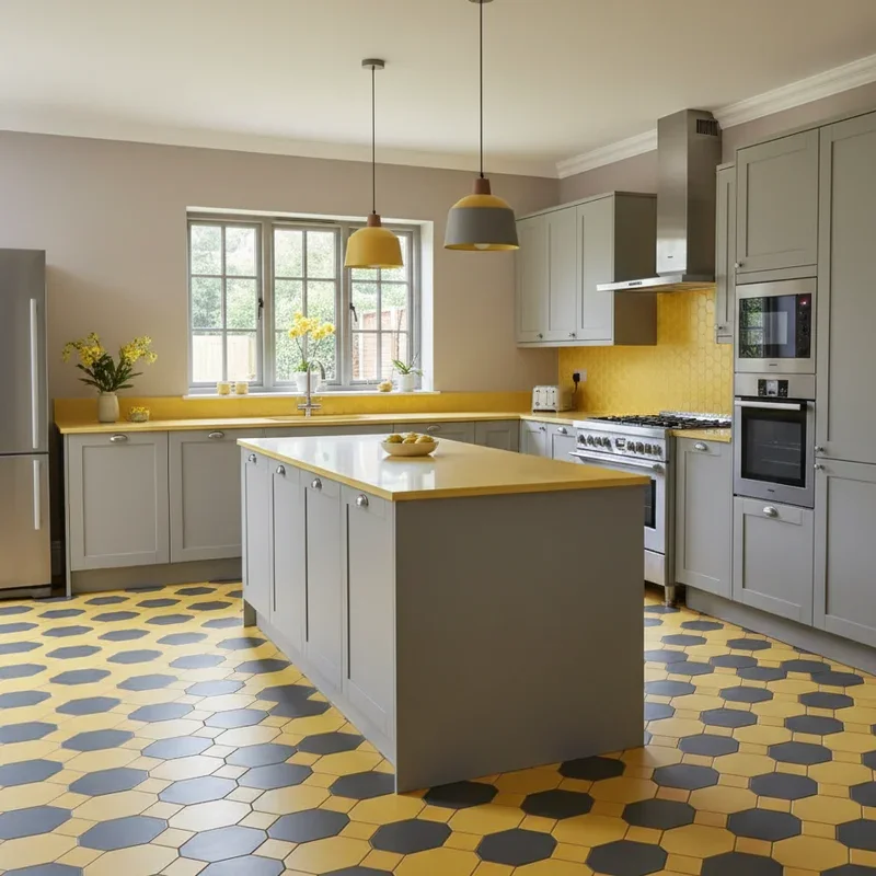 Transform your kitchen floor into an artistic statement with geometric patterns that combine grey and yellow in eye-catching designs. These patterns, whether through tiles, vinyl, or painted treatments, create visual interest that anchors your entire kitchen design. Classic patterns like chevron or herringbone feel fresh in this color combination, while modern geometrics add contemporary edge. The floor becomes your room's foundation artwork that ties all other elements together cohesively. Large patterns suit spacious kitchens while smaller repeating designs work in compact spaces without overwhelming. Consider borders or "rugs" created through pattern placement for defined areas within larger kitchens. Durable materials ensure your artistic floor withstands kitchen traffic while maintaining its striking appearance. This bold choice rewards brave homeowners with unique kitchens that stand apart from typical designs.