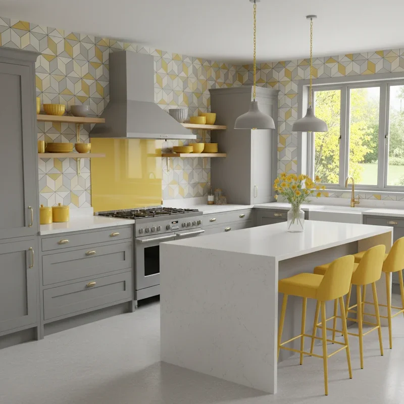 Add instant personality with grey and yellow patterned wallpaper that brings both colors together in harmonious designs. Modern patterns range from subtle geometric prints to bold botanical designs, each offering different energy levels. Wallpaper technology now offers washable, removable options perfect for commitment-phobic decorators or renters. Use wallpaper on single walls for accent or throughout for immersive pattern experiences that transform ordinary kitchens. The predetermined color balance in patterns eliminates guesswork about proportions, ensuring sophisticated rather than overwhelming results. Consider scale carefully; large patterns suit spacious kitchens while smaller prints work in compact spaces. Your walls become conversation starters that showcase personality while maintaining the practical durability kitchens require.