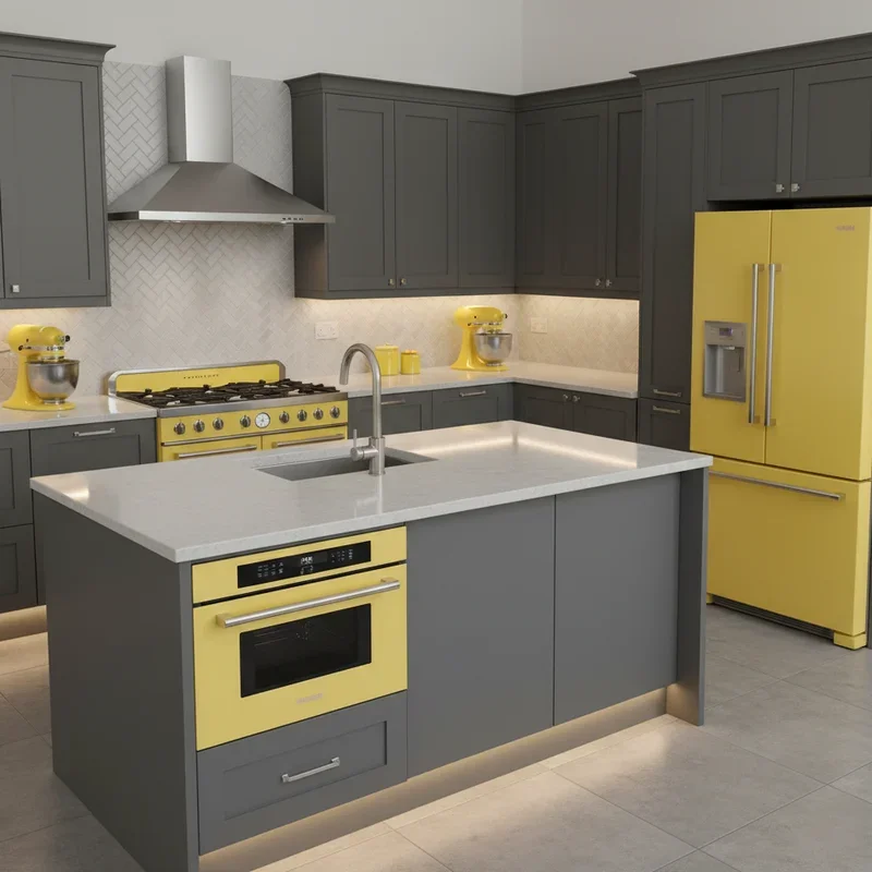 Make bold statements with yellow kitchen appliances that serve as functional art pieces against sophisticated grey backdrops. Retro-style refrigerators in sunny yellow become instant focal points that inject personality while providing essential function. Smaller appliances like toasters, kettles, and stand mixers in coordinated yellow create cohesive color stories without overwhelming investment. The grey surroundings ensure these yellow pieces feel intentional rather than random, creating curated rather than chaotic aesthetics. Modern appliance finishes in yellow often feature better durability than painted alternatives, maintaining their cheerful appearance through daily use. Consider one major yellow appliance as your statement piece, supporting it with smaller coordinated items. This approach allows personality expression through functional items that you use daily, making every kitchen task slightly more joyful.