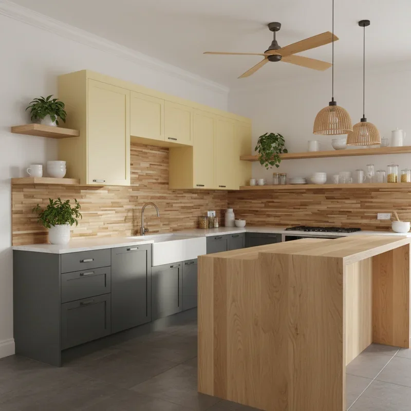 Incorporate natural wood elements that harmoniously bridge grey and yellow, adding organic warmth that prevents your color scheme from feeling too manufactured. Wood cutting boards, floating shelves, or butcher block countertops provide textural variety while complementing both colors naturally. The wood's inherent warmth echoes yellow's cheerfulness while its natural variations mirror grey's sophistication. Choose wood tones carefully; lighter woods like maple enhance brightness while darker walnuts add richness. Open wood shelving displays grey and yellow items beautifully while adding architectural interest. Wood bar stools or dining chairs provide comfortable seating that doesn't compete with your color scheme. These natural elements ground your design in organic materials that age beautifully, ensuring your kitchen remains timeless despite trendy color choices.