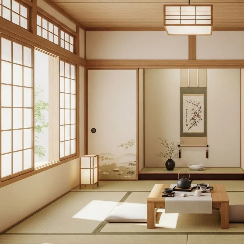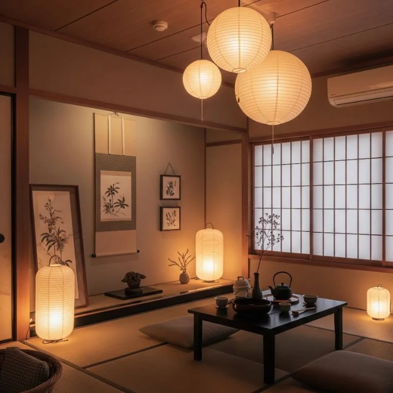 Illuminate your space with the gentle glow of paper lanterns that create the soft, diffused lighting essential to Japanese ambiance. These fixtures transform harsh overhead lighting into warm, inviting illumination that flatters both people and spaces. Multiple lanterns at varying heights create visual interest while maintaining consistent, comfortable lighting throughout the room. It's like catching fireflies and letting them light your home! Traditional paper lanterns come in various shapes from spherical to cylindrical, each casting unique shadow patterns. Modern LED versions offer energy efficiency while maintaining authentic appearance. Layer lantern lighting with other sources for flexibility. The soft light promotes relaxation and creates intimate atmosphere perfect for evening unwinding or entertaining.