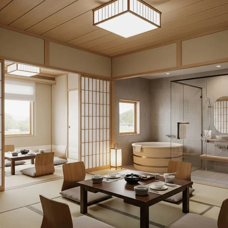 Transform your bathroom into a spa-like retreat with Japanese bathing principles that prioritize relaxation and cleanliness. Deep soaking tubs (ofuro), wooden stools, natural materials, and minimal decor create spaces for both physical and mental cleansing. Separate washing and soaking areas when possible, following Japanese bathing etiquette. It's like having an onsen hot spring in your home! Use water-resistant woods like teak or cedar for authentic warmth. Stone tiles or pebble floors add natural texture underfoot. Keep color palettes neutral and accessories minimal. Include plants that thrive in humidity for living elements. Good ventilation prevents moisture damage to natural materials. This approach transforms daily routines into restorative rituals that honor both body and space.