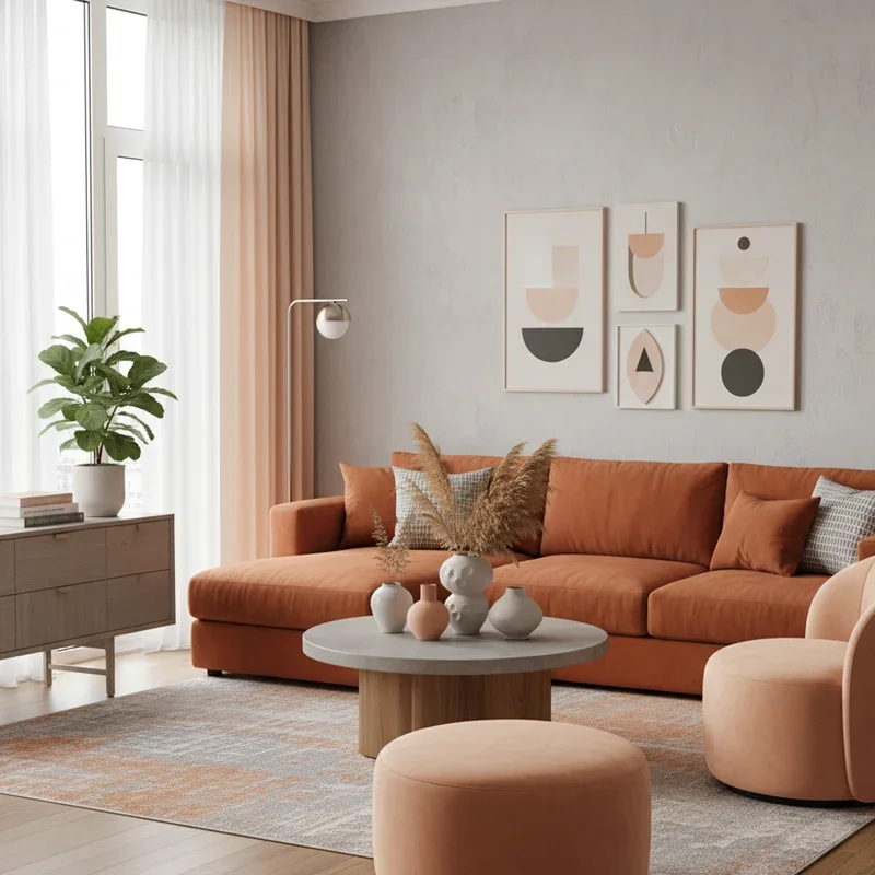 Soften orange's intensity with a peach and gray combination that feels fresh, modern, and surprisingly sophisticated! Peach brings orange's warmth without overwhelming, while gray provides a cool, contemporary balance. Use soft peach on walls with gray furniture for a gentle approach, or reverse for different impact. This palette works beautifully in rooms with varying light conditions, adapting throughout the day. Add white accents to keep the space feeling bright and airy. Charcoal gray with pale peach creates drama while light gray with vibrant peach feels playful. Incorporate both colors through artwork, pillows, and accessories for cohesive design. The combination suits various styles from Scandinavian minimalism to modern farmhouse. Metallic accents in silver or rose gold enhance both colors beautifully. Your living room feels current without being too trendy!