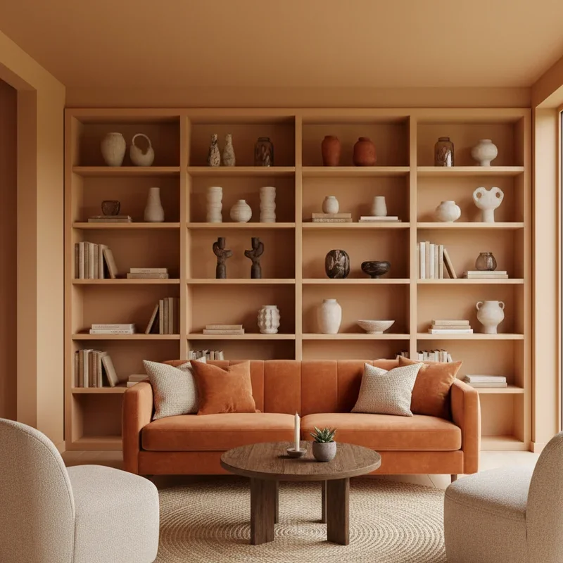 Transform functional storage into stunning focal points with apricot-painted built-in bookshelves! This soft orange shade adds warmth without overwhelming, creating beautiful backdrops for books and décor. Paint just the back wall of shelves for subtle color or go bold with fully painted units. Apricot makes book spines pop while creating visual interest even in minimally filled shelves. Style with a mix of books, plants, and decorative objects for balanced displays. The warm tone complements both colorful and neutral book collections. Add lighting within shelves to highlight the apricot color and create ambiance. This approach adds architectural interest and color without committing entire walls. Consider painting nearby trim in coordinating white or cream for finished looks. Your bookshelves become artistic statements rather than mere storage!