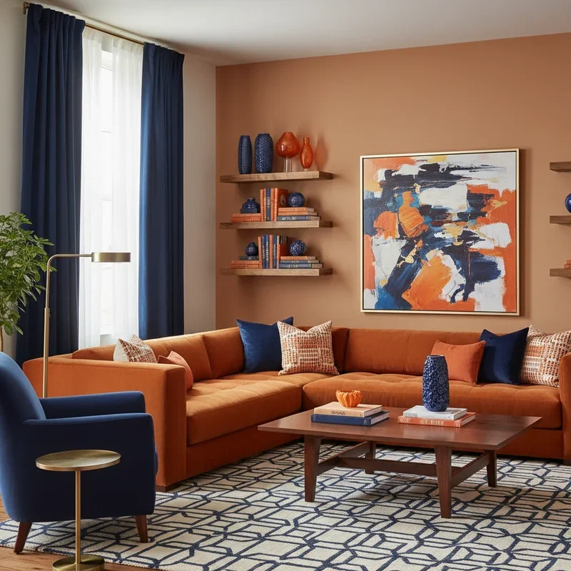 Discover the unexpected magic when orange meets navy blue in a color combination that's both bold and balanced! This complementary pairing creates visual tension that keeps your living room interesting without feeling chaotic. Use navy as your base through larger furniture pieces or walls, then layer in orange through accessories, art, and textiles. The deep blue grounds orange's energy while orange prevents navy from feeling too serious or nautical. Add white or cream as a neutral buffer to let both colors breathe. This palette works beautifully with brass or gold metallics that bridge warm and cool tones. Consider a navy sofa with orange throw pillows or orange chairs against navy walls. The combination feels fresh, modern, and surprisingly sophisticated. Your living room achieves that perfect balance between energetic and elegant!