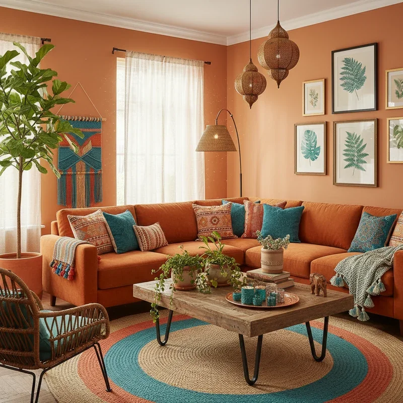 Embrace free-spirited style with an orange and teal combination that brings bohemian vibes to life! These complementary colors create vibrant energy perfect for eclectic, personality-filled spaces. Layer different shades of both colors through textiles, creating rich, globally-inspired aesthetics. Mix patterns fearlessly; orange paisley with teal geometric prints adds boho authenticity. Include natural textures like macramé, rattan, and jute to ground the bold colors. Add metallic accents in brass or copper for warmth and glamour. Plants in terracotta pots enhance the earthy, traveled feel. Floor cushions in orange and teal create casual seating perfect for bohemian gatherings. This color combination encourages creativity and conversation, making your living room feel alive. Your space becomes a colorful sanctuary that reflects adventure and artistic spirit!