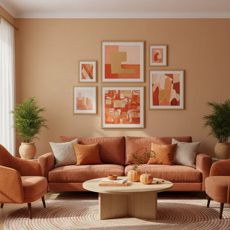 Transform blank walls into vibrant galleries with orange-dominated artwork that adds color and personality! Mix different art styles featuring orange, from abstract paintings to photography with orange subjects. Create visual interest by combining various frame sizes, styles, and art mediums. The gallery wall approach lets you incorporate orange without overwhelming the space. Balance orange pieces with black and white art for sophisticated contrast. Include mirrors with orange frames to reflect light and add dimension. Position your gallery wall as a focal point above sofas or along hallways. This approach allows for easy updates; swap pieces seasonally or as your taste evolves. Add small shelves within the gallery for three-dimensional objects in orange. Your walls become a curated exhibition of your personality and color preference!