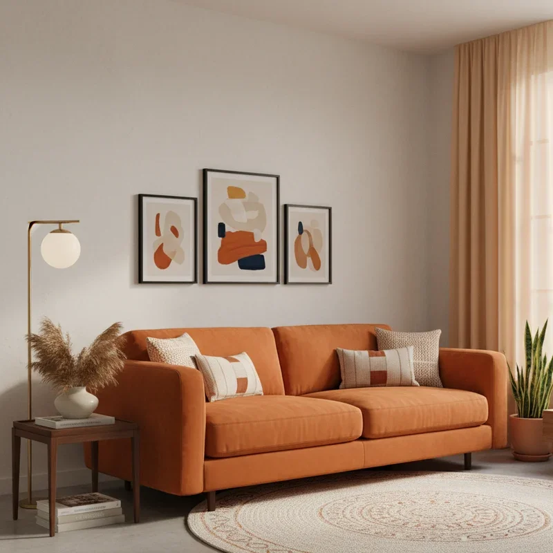 Make your sofa the star of the show with a luxurious orange velvet centerpiece that nobody can ignore! This single piece transforms your entire living room, adding color, texture, and undeniable glamour. Orange velvet catches light differently throughout the day, shifting from bright citrus to deep amber. The plush texture invites touching and lounging, making your sofa both beautiful and functional. Balance the bold sofa with neutral walls and flooring to prevent color overload. Add metallic accents through coffee tables or lamps to enhance the luxe factor. Throw pillows in complementary blues or contrasting patterns add visual interest without competing. A velvet sofa in orange works surprisingly well in various design styles, from mid-century modern to contemporary chic. Your living room becomes the neighborhood's most photographed space. Who knew one piece of furniture could completely revolutionize a room?