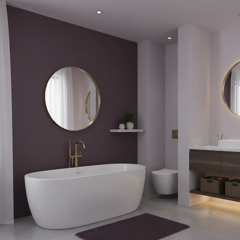 Make a bold statement without overwhelming your space by choosing one wall to showcase rich, dramatic plum! This design strategy creates a focal point that adds depth and sophistication to any bathroom size. Position your plum accent wall behind the vanity for maximum impact, where it'll frame your mirror like expensive artwork. The deep purple creates a gorgeous backdrop for metallic fixtures, making gold faucets gleam and silver accessories pop. Balance the intensity with lighter colors on remaining walls, perhaps soft gray or creamy white. This jewel tone works especially well in bathrooms with plenty of natural light, where it won't make the space feel cave-like. Add some green plants for a complementary color pop that brings life to the rich purple. Your bathroom suddenly feels like it belongs in a boutique hotel!