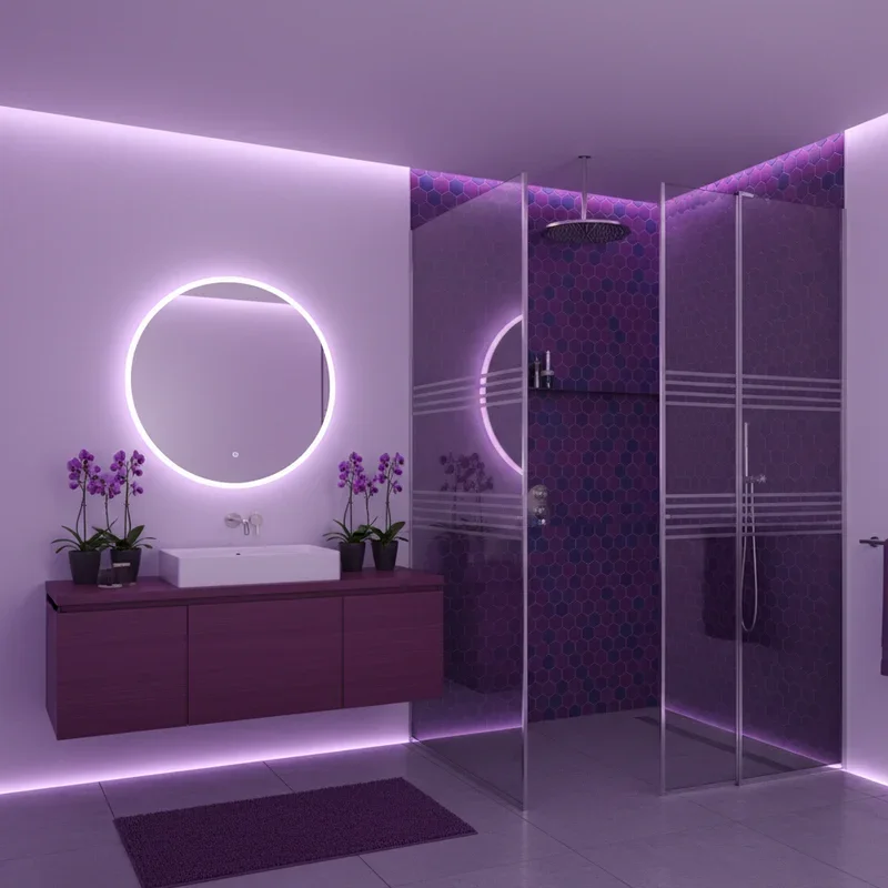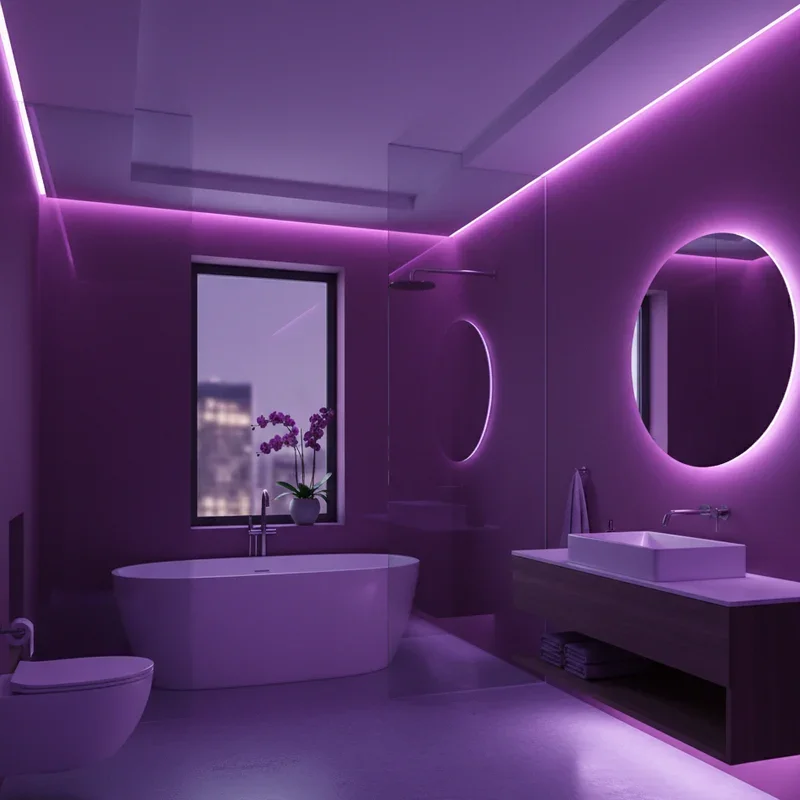 Transform your bathroom's ambiance instantly with purple LED strips that create customizable mood lighting! Install waterproof LED strips under vanities, behind mirrors, or along ceiling edges for futuristic flair. Smart bulbs in existing fixtures can shift to purple hues for evening relaxation. The ability to adjust intensity and shade means your bathroom adapts to different moods and times. Purple light has calming properties perfect for evening baths while energizing morning routines. Use color-changing bulbs to transition from bright white for tasks to soft purple for soaking. Battery-operated purple fairy lights add whimsy without electrical work. This lighting creates spa-like atmosphere without permanent changes. Your bathroom becomes a color therapy sanctuary!