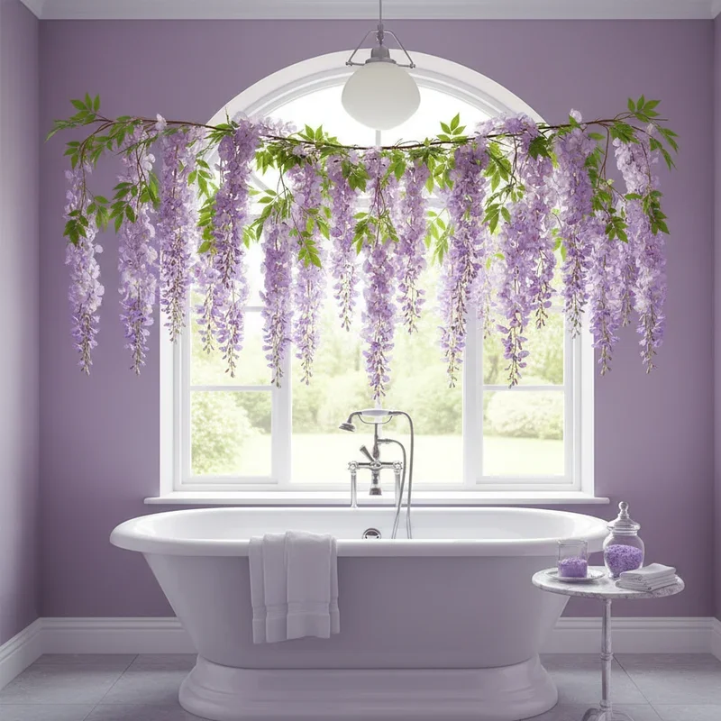 Frame your bathroom windows with flowing wisteria-colored curtains or blinds that add softness and privacy! This mid-tone purple works with any wall color while adding that essential pop of personality. Choose moisture-resistant fabrics designed for bathrooms to prevent mildew and maintain beauty. Roman shades in wisteria create structured elegance, while flowing curtains add romantic movement. Sheer purple panels filter light into a dreamy lavender glow perfect for relaxation. Layer sheers with blackout curtains for flexible privacy and light control. Coordinate with purple towels or bath mats for cohesive design. Cafe curtains in wisteria maintain privacy while maximizing natural light. Window treatments frame your view while adding essential purple touches!