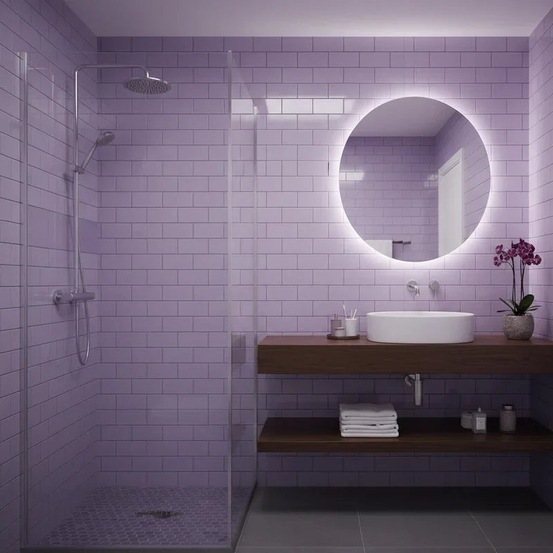 Give the classic subway tile trend a purple twist that transforms ordinary into extraordinary! Lilac subway tiles offer the perfect balance between trendy and timeless, adding color without overwhelming your space. Install them as a backsplash behind your vanity, in your shower surround, or go bold with full wall coverage. The rectangular shape keeps things classic while the purple hue adds personality. White grout creates a crisp, defined look, while matching purple grout offers seamless sophistication. The glossy finish of ceramic tiles reflects light beautifully, making small bathrooms appear larger. Mix in some white subway tiles for a checkered pattern or gradient effect if solid purple feels too intense. These tiles are easy to clean and maintain, practical benefits that complement their aesthetic appeal. Your bathroom becomes Instagram-worthy without sacrificing functionality!