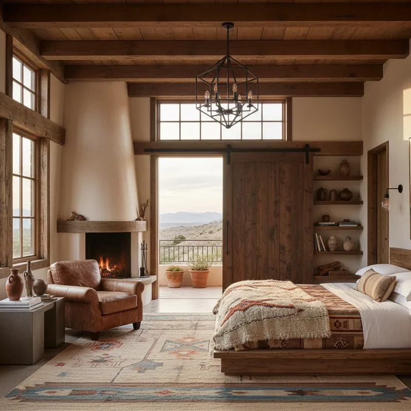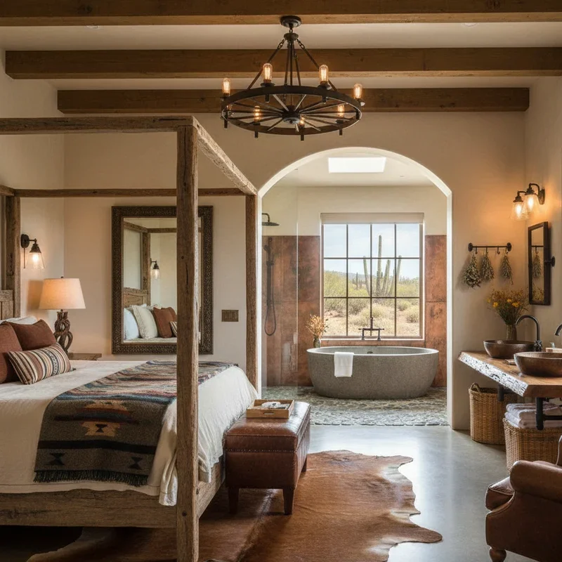 Transform your bedroom into a sophisticated sanctuary where modern comfort meets ranch-style serenity. Start with a platform bed in rich wood or upholstered leather, keeping lines clean and unfussy. Layer bedding in natural linens and wools, choosing solid colors with maybe one statement blanket featuring a subtle western pattern. Replace traditional nightstands with live-edge wood slabs mounted as floating shelves, or sleek metal tables with leather details. A statement headboard crafted from reclaimed barn doors or a large piece of contemporary western art anchors the space. Keep technology hidden; install outlets in nightstands and use smart lighting you can control from bed. Add warmth through a bedroom fireplace, if possible, or a seating area with a leather chair perfect for morning coffee. This retreat should feel like a luxury hotel suite on a modern ranch, where every element promotes rest and rejuvenation.