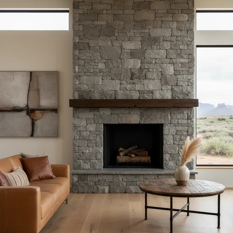 5. Minimalist Fireplace with Stacked Stone Surround