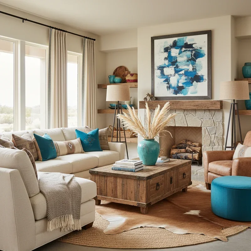 Think beyond brown and beige; modern western style embraces sophisticated neutrals punctuated by strategic color placement. Start with a foundation of warm whites, soft grays, and natural wood tones that create a calming backdrop. Then introduce turquoise, that quintessential southwestern hue, through carefully chosen accents. Picture throw pillows in rich turquoise against a gray linen sofa, or a single statement chair upholstered in turquoise leather. Native American-inspired patterns in turquoise and white add cultural depth without overwhelming the space. You might paint an interior door in deep turquoise for an unexpected surprise, or display turquoise pottery on white floating shelves. This color strategy keeps your space feeling fresh and contemporary while honoring western tradition. The key is restraint; turquoise should dance through your room like an accent note in a song, not dominate like a loud chorus.