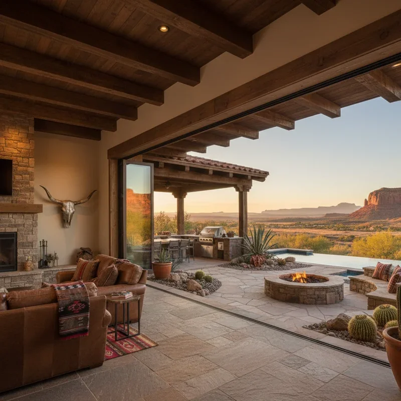 Extend your western-modern aesthetic beyond walls to create outdoor rooms that feel like natural extensions of your interior. Design covered patios with steel beam construction supporting wood ceilings that echo indoor materials. Outdoor kitchens combine stainless steel appliances with stone countertops and reclaimed wood cabinetry. Modern fire tables surrounded by deep-seated furniture in weather-resistant leather-look fabrics create gathering spots for cool evenings. String Edison bulbs overhead or install modern lantern-style fixtures for ambiance after dark. Use large planters in corten steel or concrete to display native plants and succulents. Privacy screens made from horizontal wood slats or decorative metal panels define spaces while maintaining openness. Include technology through outdoor speakers, motorized screens, and smart lighting systems controlled from your phone. These transitional spaces prove that western modern style thrives equally well under roof or sky.