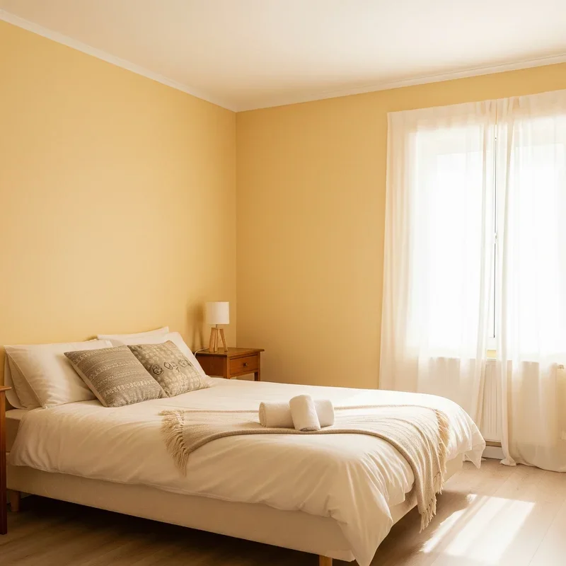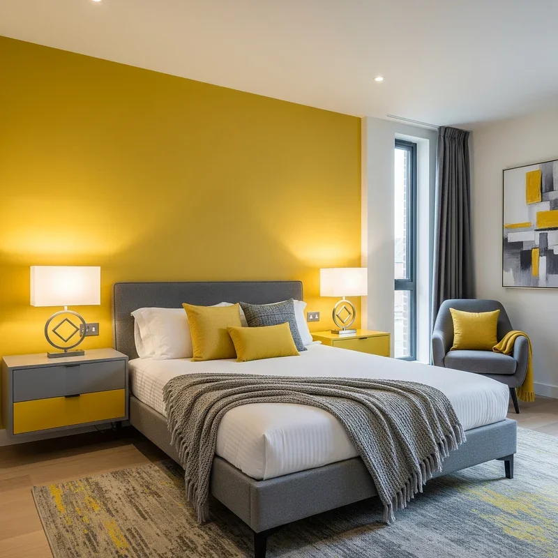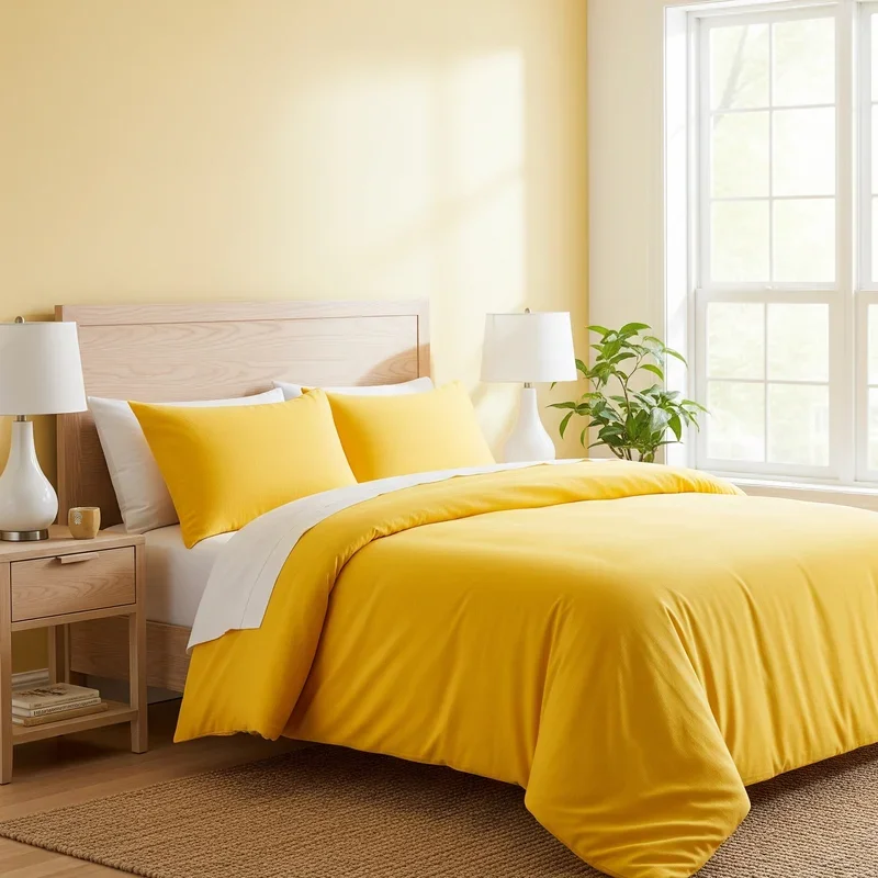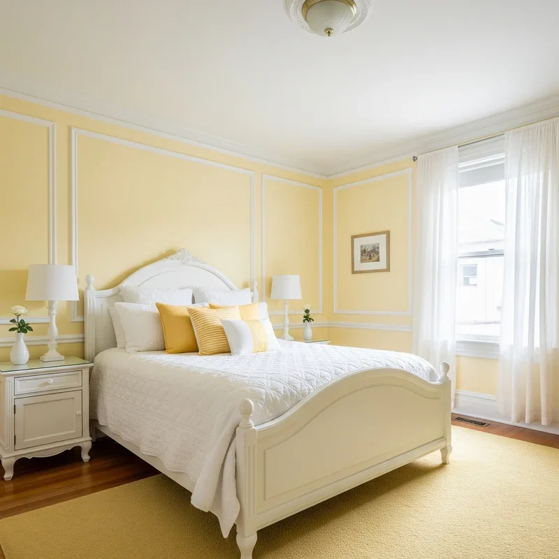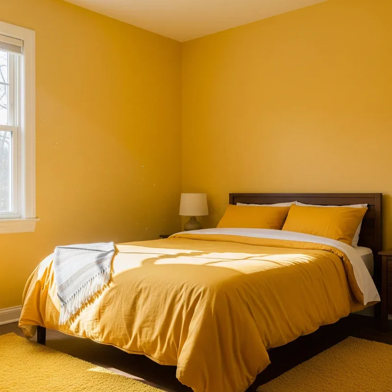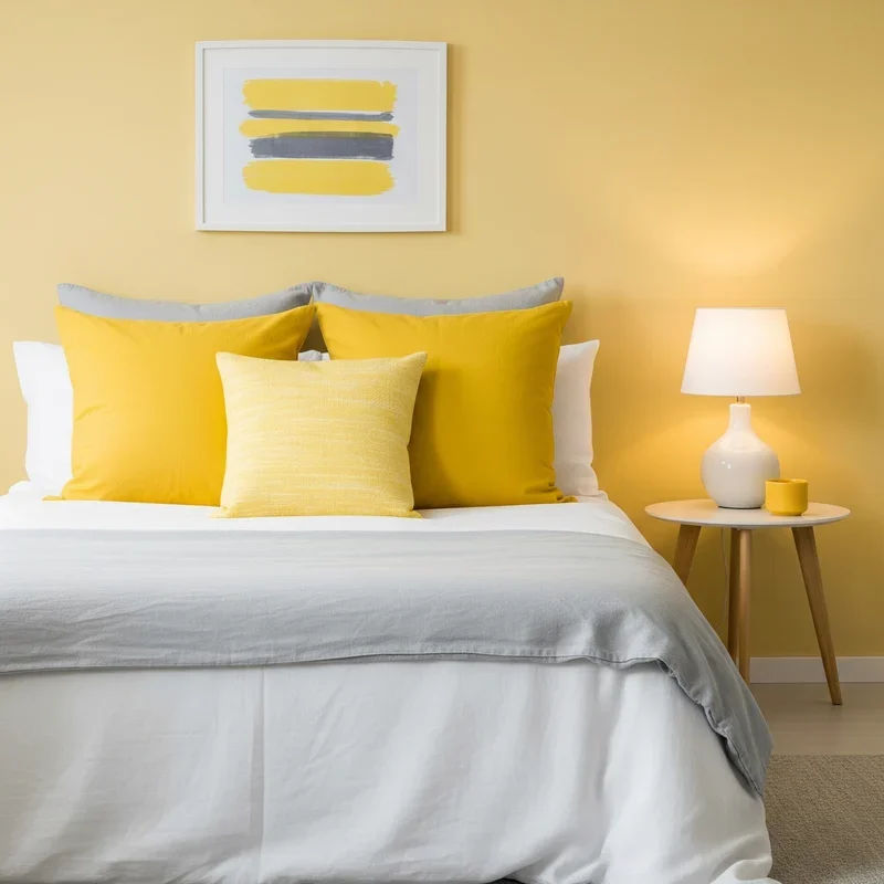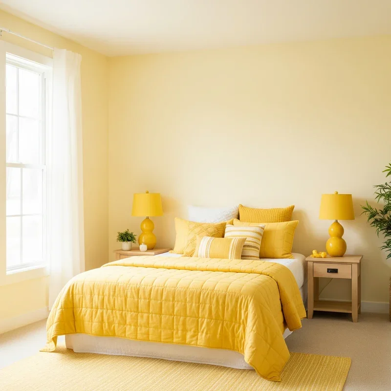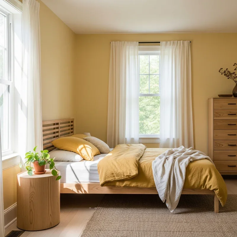 A5: Soft butter, pale gold, or muted mustard create cozy bedroom atmospheres.