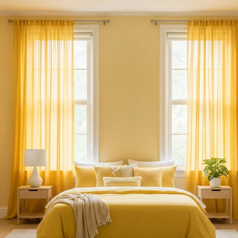 Think of yellow curtains as sunshine you can control with a pull cord. These vertical streams of color frame your windows beautifully while filtering natural light to create a warm, golden glow throughout your bedroom. Sheer yellow curtains offer subtlety, creating a soft ambiance without blocking light. For more drama, choose heavier fabrics in deep golden or mustard tones that make a bold statement even when drawn. The movement of curtains adds life to your space, creating dynamic shadows and highlights as they sway. Yellow curtains pair wonderfully with white or gray walls, creating a balanced look that feels intentional yet effortless. During golden hour, these curtains amplify the natural light, bathing your room in warmth. Consider floor-length panels for maximum impact and a luxurious feel.