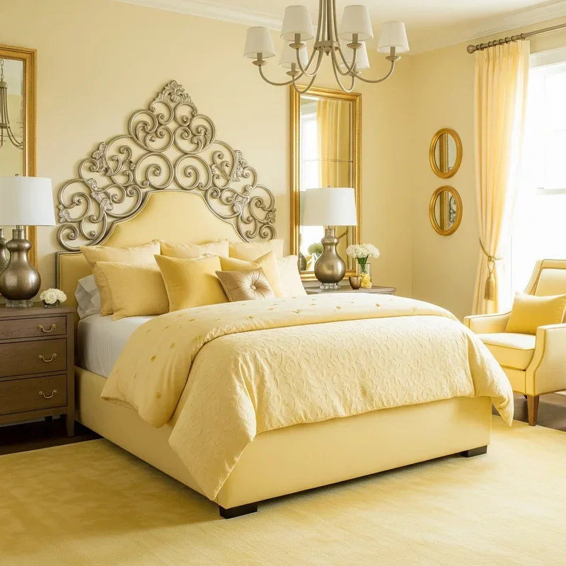 Elevate your yellow bedroom to luxurious heights by combining pale yellow with metallic gold accents. This sophisticated approach adds glamour without ostentation, creating a space that feels both warm and refined. Pale yellow walls provide a soft backdrop that lets gold elements shine without competing. Consider gold-framed mirrors, metallic throw pillows, or brass light fixtures to introduce shimmer. The reflection of metallic surfaces amplifies light, making your room feel larger and brighter. This combination works particularly well in bedrooms with vintage or art deco influences. Layer different metallic finishes like brushed gold, antique brass, and rose gold for added dimension. The key lies in restraint; too much metallic can feel overwhelming. Use gold strategically as an accent rather than a dominant element to maintain elegance.