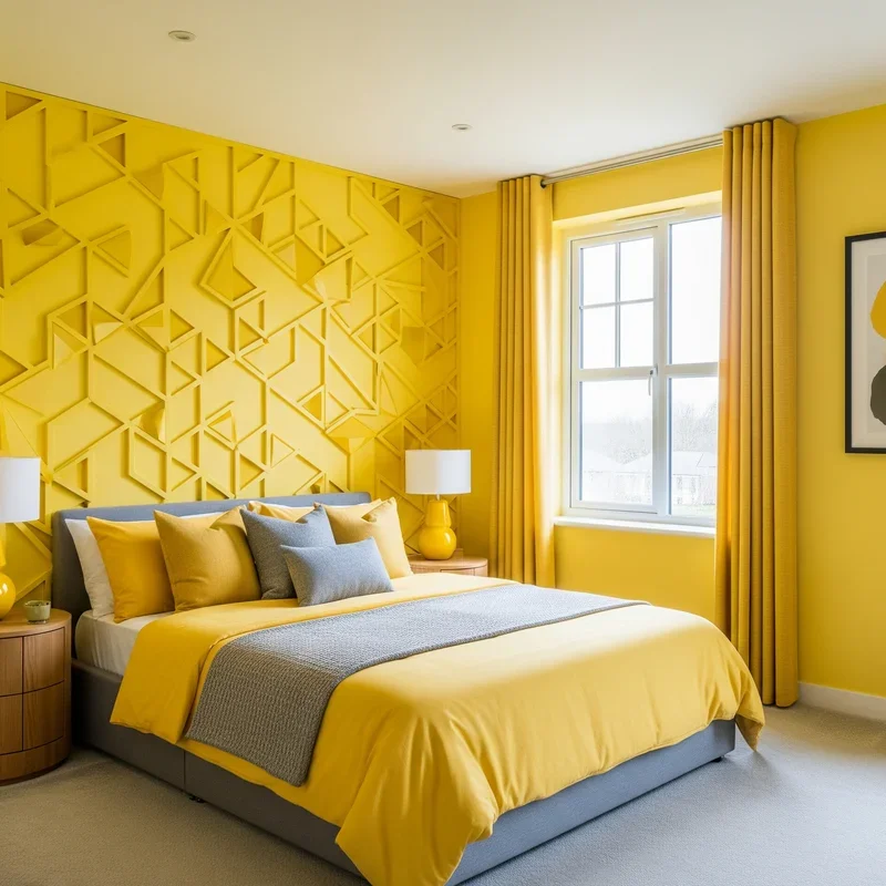 Inject energy and movement into your bedroom with yellow geometric patterns that captivate without overwhelming. Whether through wallpaper, bedding, or area rugs, geometric designs in yellow create focal points that feel modern and intentional. Chevron patterns add dynamism, while hexagons bring contemporary edge. The repetition of shapes creates rhythm that guides the eye around the room. Mix scales by combining large geometric wallpaper with smaller patterned pillows. This approach works particularly well in minimalist spaces where patterns become art. Consider limiting geometric patterns to one or two elements to prevent visual chaos. Yellow and white geometric combinations feel fresh and clean, while yellow and black create bold contrast. The key lies in balance; let one geometric element dominate while others play supporting roles in your design story.