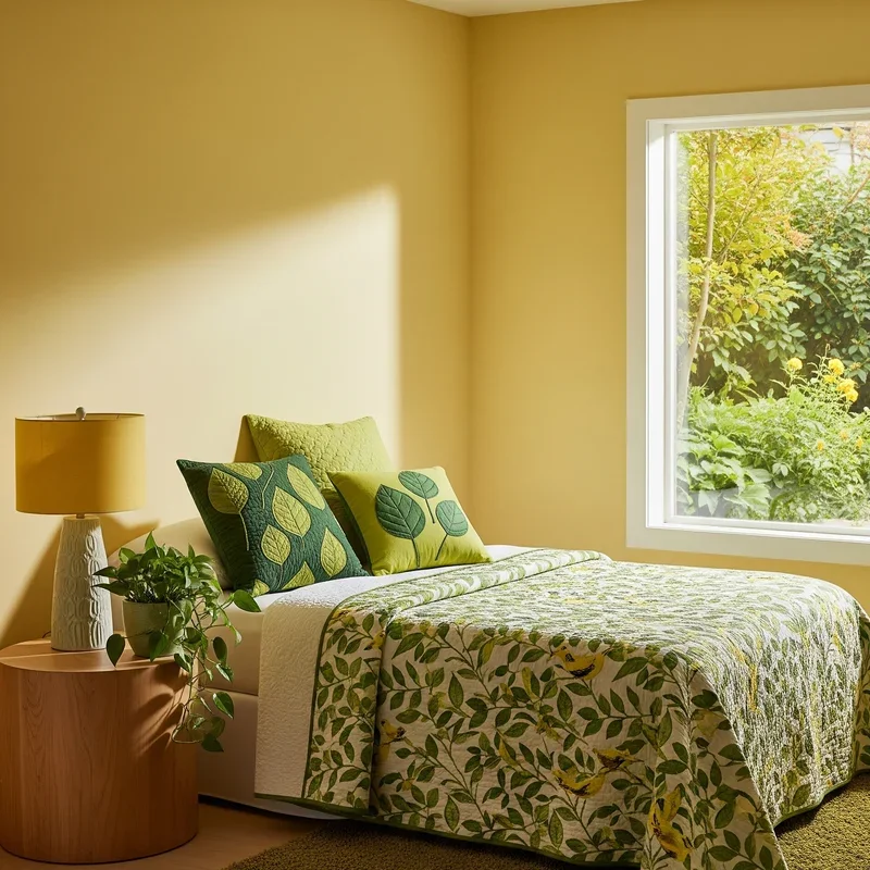 Bring the outdoors in by combining yellow with various shades of green, creating a nature-inspired palette that feels fresh and alive. This combination mirrors sunny meadows and garden scenes, promoting tranquility and connection with nature. Soft sage walls with yellow accents feel serene, while emerald green with bright yellow creates drama. Add botanical prints, live plants, and natural textures to strengthen this theme. Consider yellow flowers in green vases or green plants in yellow pots for easy color integration. This palette works beautifully with white or natural wood furniture. The key lies in choosing the right shades; mint and lemon feel playful, while forest green and gold feel sophisticated. Layer different tones of both colors through textiles, creating depth without monotony. This combination creates a bedroom that feels like a personal greenhouse.