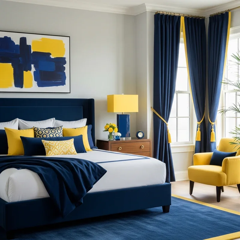 Elevate your bedroom design by combining yellow with navy blue, a pairing that exudes confidence and sophistication. This complementary color scheme creates perfect balance; navy's depth anchors yellow's brightness, resulting in a space that feels both energetic and grounded. Start with navy walls and add yellow through artwork, pillows, or a statement lamp. Alternatively, use yellow walls with navy furniture and textiles. The contrast creates visual tension that keeps the eye engaged without overwhelming. This combination works particularly well in nautical or preppy design schemes but adapts easily to modern aesthetics. Consider adding brass or gold hardware to bridge these colors beautifully. The key lies in proportion; typically, one color should dominate while the other provides strategic pops. This palette creates a bedroom that feels pulled together and intentionally designed.