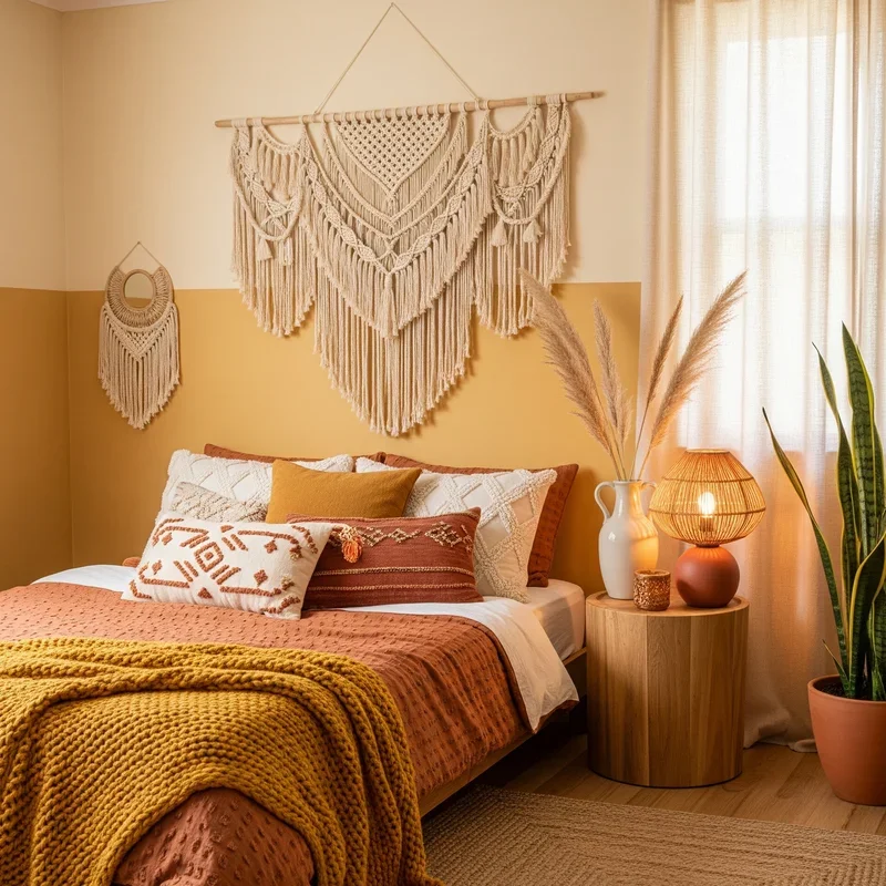 Embrace earthiness by combining ochre yellow with terracotta tones for a bohemian paradise that feels both grounded and free-spirited. This warm palette creates a cozy atmosphere reminiscent of desert sunsets and autumn afternoons. Layer different textures like macramé wall hangings, woven baskets, and jute rugs to enhance the boho aesthetic. Ochre yellow works beautifully in textiles like throw blankets and cushion covers, while terracotta can appear in pottery, artwork, or accent furniture. Add plenty of plants to bring life to this earthy combination. The key to nailing this look lies in embracing imperfection and mixing patterns fearlessly. Consider adding wooden elements and vintage finds to complete the vibe. This color combination creates a bedroom that feels like a personal retreat, where creativity flows and relaxation comes naturally.